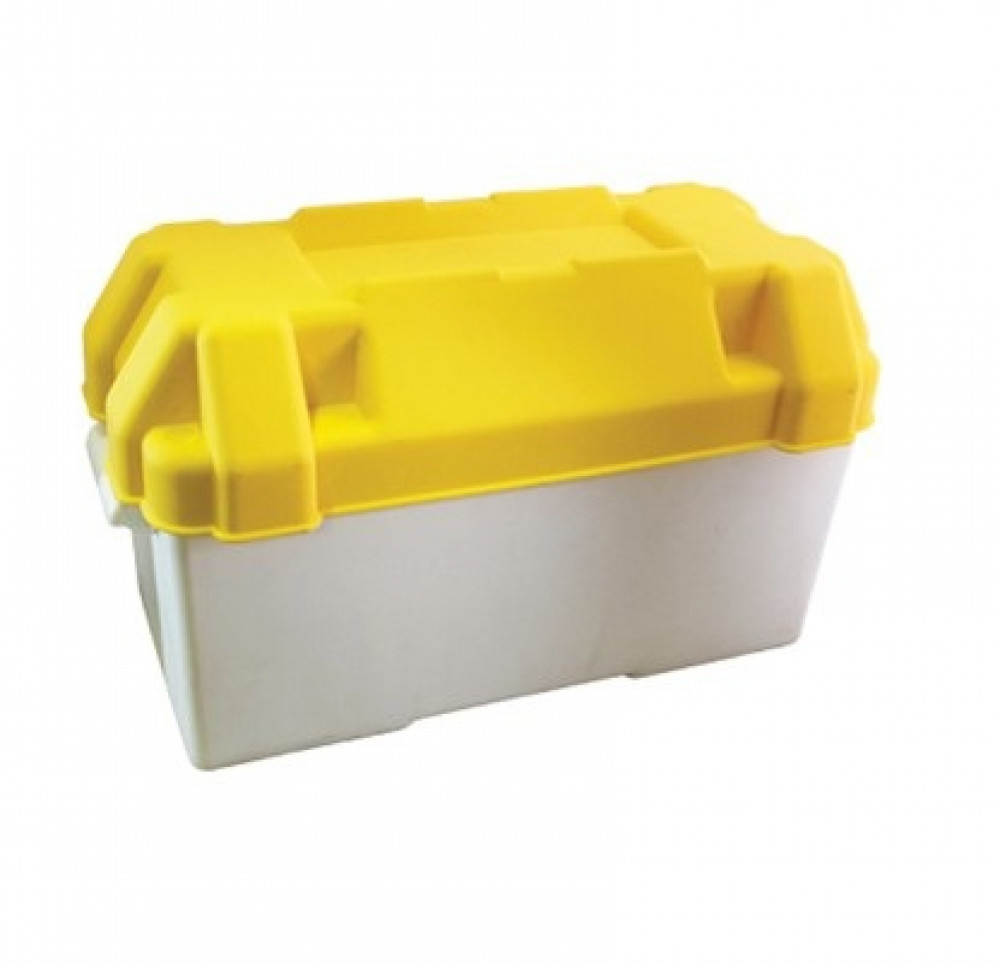Accubak gemaakt van zuur- en petroleumbestendig kunststof met spatwaterdichte deksel. Wordt geleverd met een riem om af te sluiten en te vervoeren.