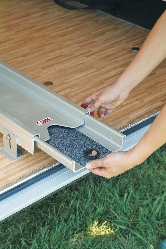 Verbeterde versie: voorzien van antislip laag. Motorfietsdrager bestaande uit twee telescopische rails van gegalvaniseerd aluminium. Eenvoudige montage in de garageruimte van de camper met behulp van de bevestigingssteuntjes die in hoogste verstelbaar zijn van 8 tot 11 cm. Bestaat uit een rail die op de grond van de garage moet worden bevestigd en een oprijrail die heel eenvoudig in de garagerail geschoven kan worden. Geleverd inclusief 2 stevige spanbanden om de motorfiets mee vast te zetten tijdens het rijden.