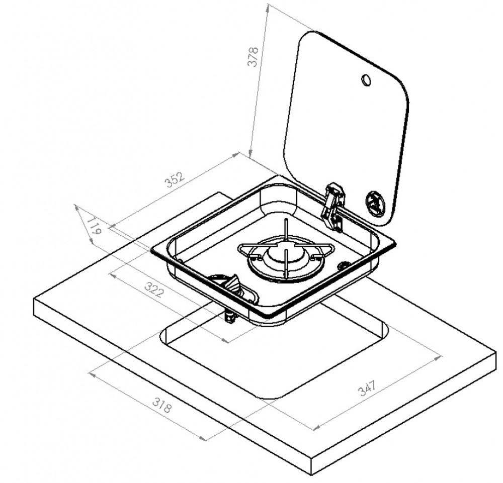 RVS Inbouwkookplaat met fraai afgewerkt glazen deksel. Uitgerust met 1 brander.