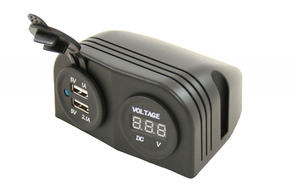 Power Line voltmeter met 2x een USB lader; 1x 1A en 1x 2.1A.